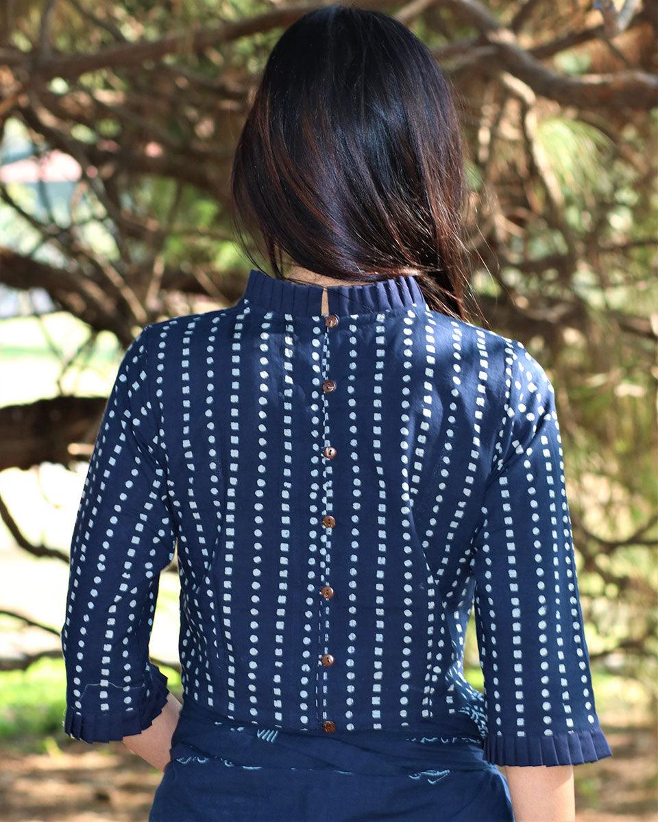 Introducing our Blue Handblock Printed Cotton Blouse, a fusion of traditional craftsmanship and contemporary style. This exquisite blouse features intricate handblock printing and a vibrant blue color. The flattering half sleeves, collar neck, and back buttons add elegance and ease to your outfit. Made from high-quality cotton, this blouse is comfortable and versatile. Elevate your style with our Blue Handblock Printed Cotton Blouse.